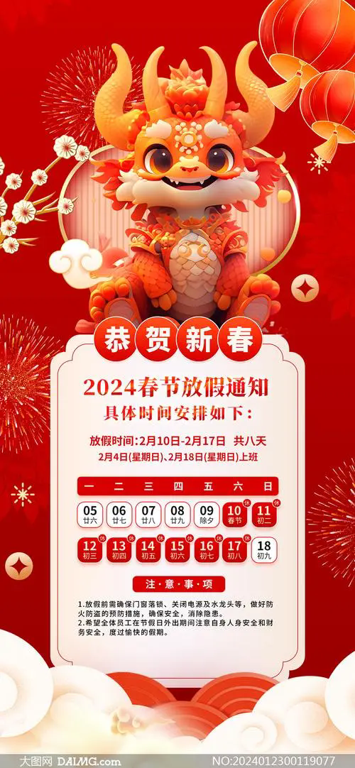 根據(jù)《國(guó)務(wù)院辦公廳關(guān)于2024年部分節(jié)假日安排的通知》,2月10日至17日放假調(diào)休,共8天。2月4日(星期日)、2月18日(星期日)上班。鼓勵(lì)各單位結(jié)合帶薪年休假等制度落實(shí),安排除夕正式放假(2月9日)休息。停止發(fā)貨時(shí)間為2月3號(hào)。請(qǐng)各部門(mén)做好安全檢查,相關(guān)工作安排和處理。